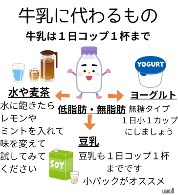 • 代わりに 低脂肪乳・豆乳・無糖ヨーグルト・アーモンドミルク などを上手に分散して摂ると、健康的に栄養補給ができる